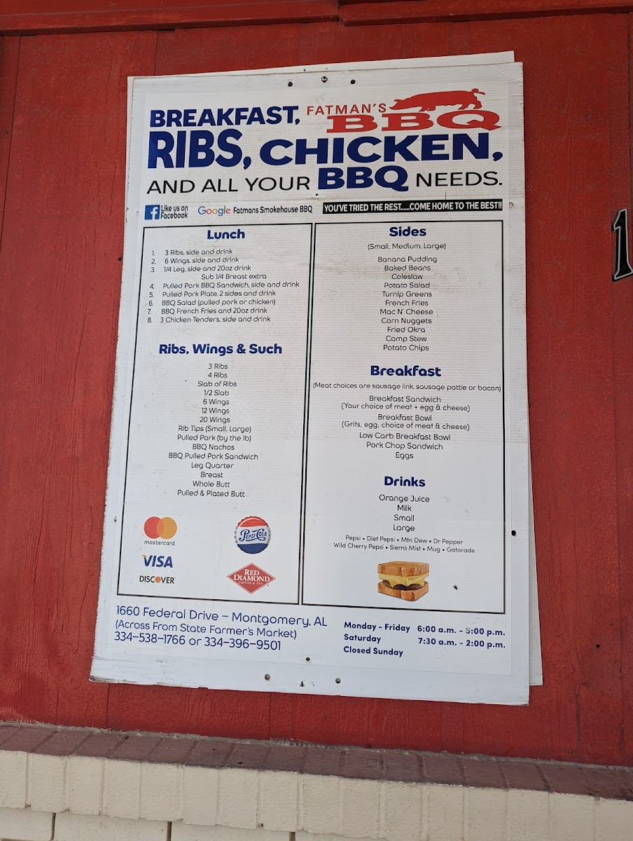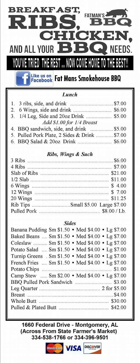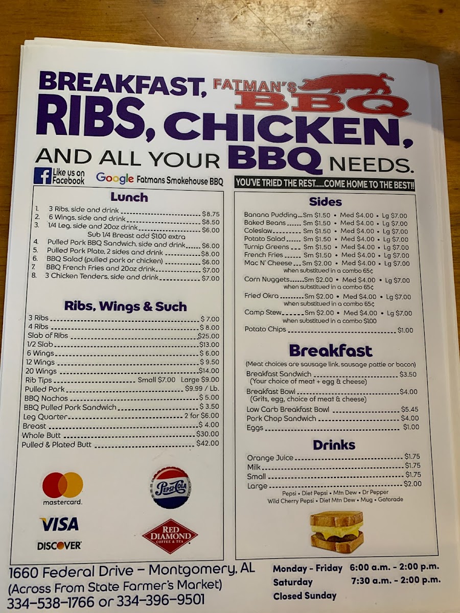 Welcome to Fat Man's Smokehouse BBQ, a pearl in Montgomery, AL, where BBQ dreams come true. This eatery offers a menu brimming with flavor, featuring breakfast delights like Breakfast Sandwiches and Pork Chop Sandwiches, alongside comforting Sides such as Grits and Sausage. The star of the show, however, is the meticulously smoked BBQ. Customers rave about the tender, moist ribs that are so well-seasoned they often forgo sauce. The pulled pork is equally impressive, boasting a rich, sweet flavor enhanced by a touch of vinegar and sugar.
